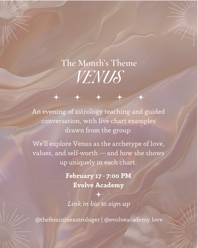 This facilitated space invites participants to learn astrology through dialogue and lived experience. This month's theme focuses on Venus--exploring love, values, pleasure, and self worth through the birth chart.